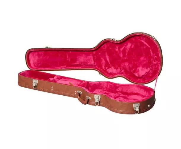 La guitare possède un corps en acajou avec une table en érable, un manche en acajou monobloc, une touche en laurier, un tenon à col long et un profil de manche personnalisé légèrement plus fin que celui de 1959. La tête de tête « livre ouvert » de style Gibson affiche un logo Epiphone nacré. Le pont Gibson Historic Wraparound est équipé de vis de réglage à l’intonation. Les composants électroniques incluent des micros Gibson Burstbucker™ PRO Alnico 5, un câblage des années 50 avec potentiomètres CTS® et condensateurs Grey Tiger, ainsi qu’un sélecteur à 3 voies Switchcraft® et un jack de sortie. Un étui rigide marron/rose de style vintage est également inclus.