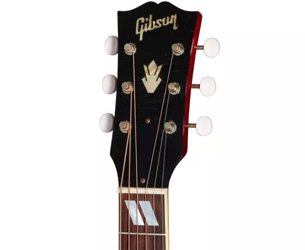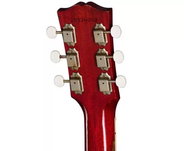 Cette Country Western de 1963 est dotée d’une table en épicéa de Sitka vieillie thermiquement, renforcée par un barrage en « X » scallopé à la main pour un son vintage. Le dos et les éclisses sont en acajou massif, avec un binding multi-plis, un manche en acajou et une touche en palissandre indien. Le diapason est de 24,75 po (628,65 mm) avec un profil arrondi, un radius de touche de 12 po, 20 frettes standard et des incrustations en perle de nacre en forme de parallélogrammes. Le manche à radius composé présente une jonction traversante par queue d’aronde et est assemblé à la colle de peau chaude. Le chevalet en palissandre a un design traditionnel « belly-up », avec un sillet, un sillet de tête et des chevilles en os. Les mécaniques sont des accordeurs Gotoh® en nickel vieillie avec des boutons blancs, offrant une stabilité d’accordage. Cette guitare présente un vieillissement significatif pour reproduire l’aspect d’une guitare jouée depuis des années. Un étui rigide Gibson Custom noir avec intérieur doré, ainsi qu’un certificat d’authenticité, sont inclus.