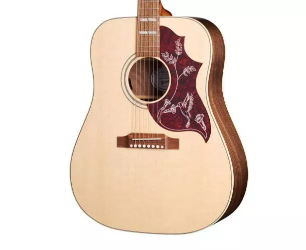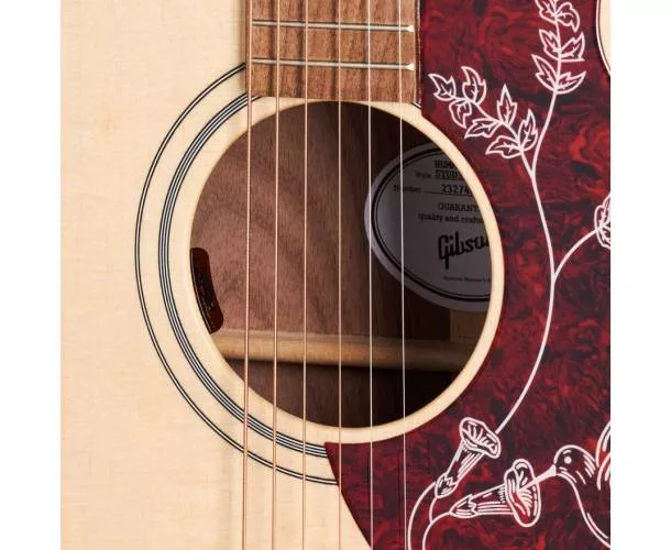 Le modèle Hummingbird™ Studio Walnut perpétue l'héritage de Gibson dans la création de designs à épaules carrées emblématiques, tels que le Hummingbird et le Dove™. Fabriqué à la main à Bozeman, Montana, ce modèle utilise des bois de tonalité massifs, comprenant un dessus en épicéa Sitka avec une finition en vernis nitrocellulosique brillant, offrant une plage dynamique étendue, une réactivité au jeu et un ton équilibré. Le noyer avec une finition en vernis nitrocellulosique satiné, utilisé pour l'arrière et les côtés, produit une réponse tonale chaude et riche, avec des basses et des aigus plus prononcés que les modèles en acajou. Le corps à pleine profondeur assure une tonalité riche, un excellent volume et une bonne projection. Équipé d'un profil de manche Advanced Response, ce modèle est conçu pour le confort et la jouabilité. La touche en noyer, avec 20 frettes de taille standard, présente des incrustations en parallélogramme, un élément signature du design Hummingbird. Le radius de 16” facilite le jeu rapide. La tête est dotée de mécaniques Grover® Rotomatic® pour une meilleure stabilité d'accordage et d'un sillet Graph Tech® TUSQ® pour un accordage optimal. Les graphismes du pickguard ajoutent une touche classique. Ce modèle inclut un micro à piezzo actif L.R. Baggs™ Element Bronze sous le chevalet, avec un contrôle de volume monté sur l'orifice sonore pour un accès facile. Livré avec un étui rigide moderne pour transport et protection, c'est un compagnon musical exceptionnel, prêt à vous suivre partout.