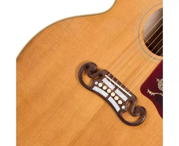 Aujourd'hui, Gibson Custom présente le modèle 1957 SJ-200 Light Aged, une reproduction fidèle des majestueux modèles vintage Super Jumbo. Ce modèle dispose d'un dos en érable moiré AAA, de côtés en érable moiré AAA, et d'une table en épicéa de Sitka vieillie thermiquement, renforcée avec des barrages traditionnels en X festonnés, installés avec de la colle de peau. Le manche en érable AAA de 25,5 pouces présente un logo Gibson en nacre et une incrustation en forme de couronne, accompagné de mécaniques Gotoh dorées avec des boutons Keystone. La touche en palissandre comprend 20 frettes standard et est décorée d'incrustations en nacre. Le sillet, le chevalet et les chevilles de chevalet sont en os, tandis que le chevalet en palissandre SJ-200 à quatre barres Moustache comprend également des incrustations en nacre. Le pickguard en tortue SJ-200 arbore les graphiques classiques. Ce modèle, marqué par un vieillissement léger réalisé par les artisans qualifiés du Murphy Lab, simule des décennies d'usure légère, offrant au 1957 SJ-200 Light Aged le caractère et la sensation d'un instrument original de l'époque dorée de Gibson. Il est livré dans un étui rigide Lifton de style des années 50, complétant l'expérience authentique de jeu et de possession vintage.