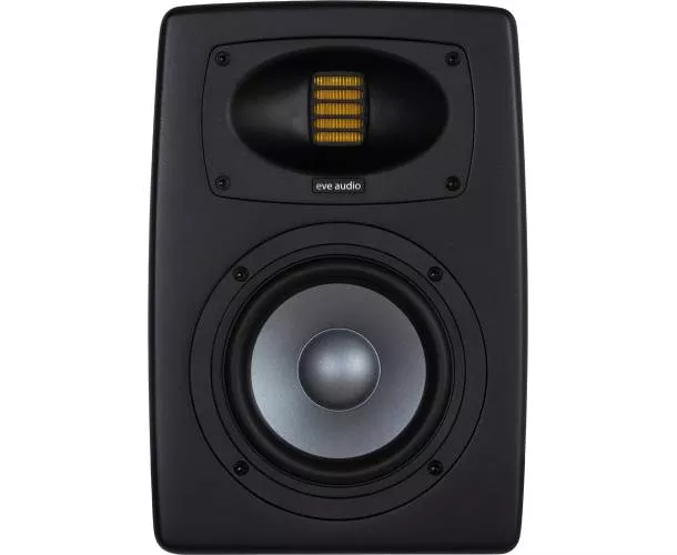 - Logo "eve audio" orienté vers l'avant, indiquant l'état du système