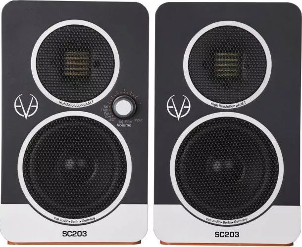 La structure est spécialement conçue pour répondre aux exigences des petits woofers, incluant un châssis de panier perméable à l'air pour réduire les distorsions. Un puissant aimant agit comme un moteur, maintenant le woofer stable. De plus, un radiateur passif à l'arrière renforce la reproduction des basses jusqu'à 62 Hz (-3 dB) avec très peu de distorsion. Le SC203 est configuré comme un ensemble de haut-parleurs de bureau actif-passif à 2 voies, alimenté par quatre amplificateurs de 30 W dédiés, assurant un contrôle précis.
