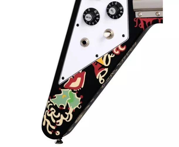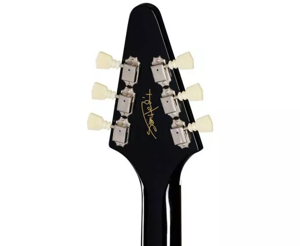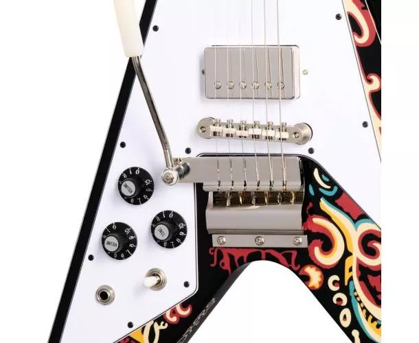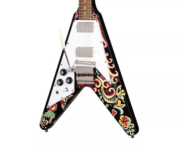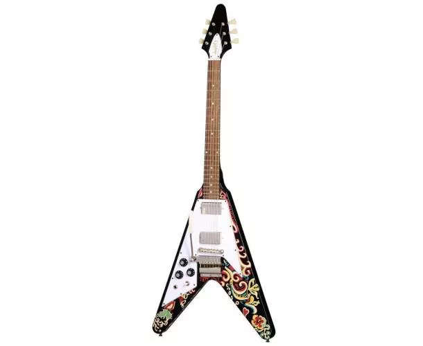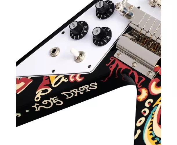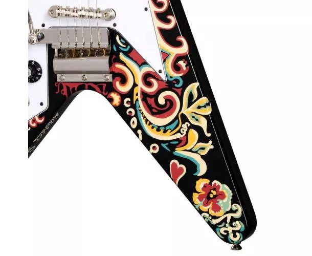 Inspirée par la Flying V personnalisée de Jimi Hendrix™, Epiphone, en partenariat avec Gibson Custom et la famille Hendrix, dévoile une collection unique. La Jimi Hendrix « Love Drops » Flying V™ est une réinterprétation d’une guitare emblématique utilisée par Jimi de 1967 à 1969. Initialement en Sunburst, cette version en ébène est ornée de graphismes psychédéliques peints à la main par Hendrix, soigneusement recréés. Ce modèle présente un corps en acajou, un manche en acajou monobloc avec un profil en C arrondi, une touche en laurier et 22 frettes médium jumbo. Le logo Inspired by Gibson Custom et la signature de Jimi décorent l'arrière de la tête de la guitare de style 1967. Les accordeurs Epiphone Deluxe assurent la tenue des cordes, tandis qu’un Maestro™ Vibrola™ fixe le vibrato. Également inclus, trois micros Humbucker™ Custom Bucker Gibson, des potentiomètres CTS®, un condensateur Mallory™ et un commutateur Switchcraft®. Un étui rigide avec des logos Inspired by Gibson Custom et Authentic Hendrix™ est fourni.