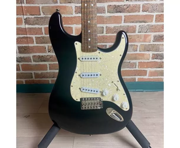 Équipée de trois micros simple bobinage Fender Designed Alnico, elle délivre des sonorités claires, brillantes et dynamiques, parfaitement adaptées au rock, funk, blues et pop. Le vibrato synchronisé vintage à 6 pontets permet des effets expressifs tout en conservant un look résolument rétro.
