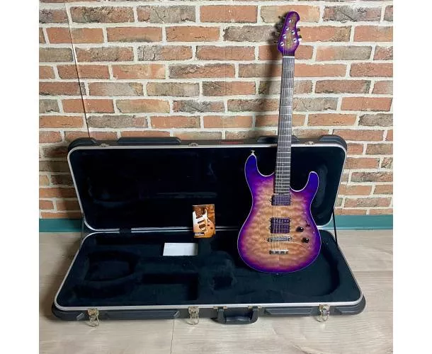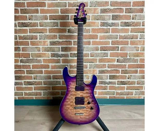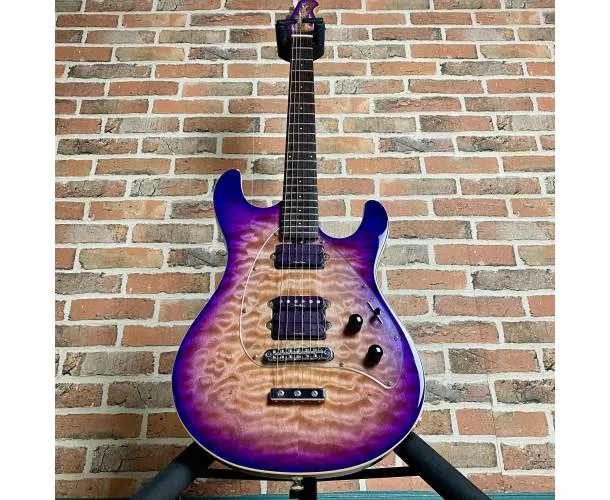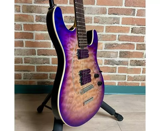 Sa table en érable ondé magnifiquement figurée, associée à une tête assortie, confère à cette version une esthétique aussi élégante que distinctive. La finition Purple Sunset met parfaitement en valeur les veines de l’érable, contrastant avec le dos et les éclisses noir opaque, soulignés par un binding crème raffiné.