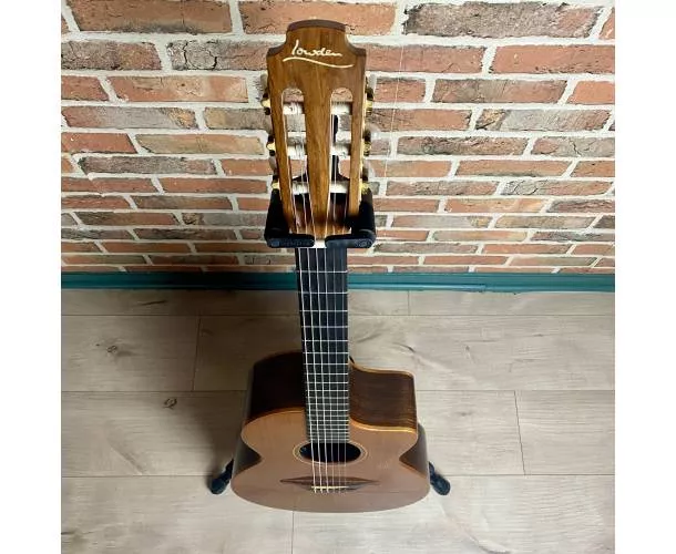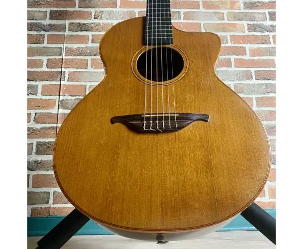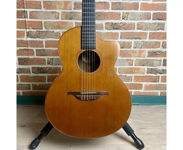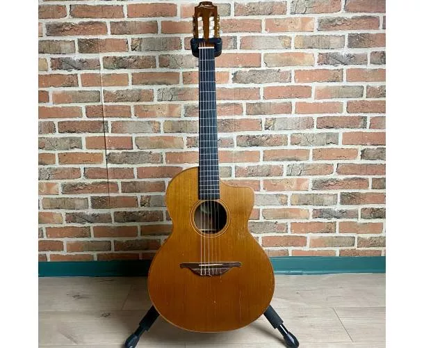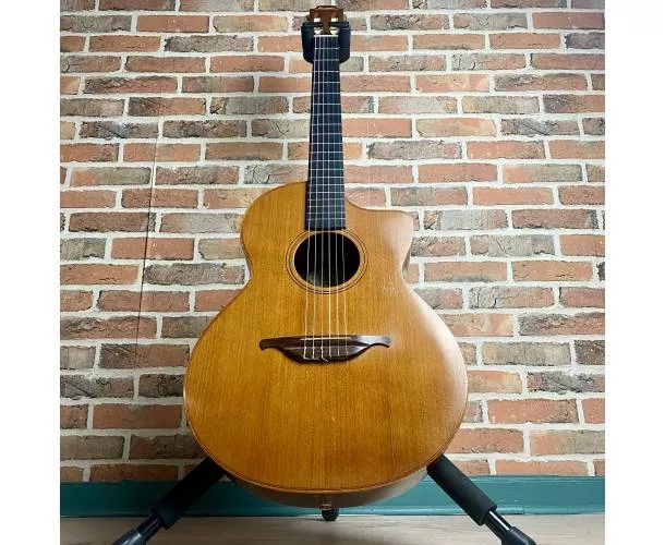 Datant de 1994, ce modèle au format Cross Over offre un équilibre parfait entre confort de jeu et projection sonore. Les années ont permis à l’instrument de s’ouvrir pleinement, révélant une sonorité chaleureuse, ample et très musicale. La table en cèdre massif, magnifiquement patinée et faïencée par le temps, procure une attaque douce et expressive, tandis que le dos et les éclisses en palissandre massif apportent profondeur, richesse harmonique et sustain.
