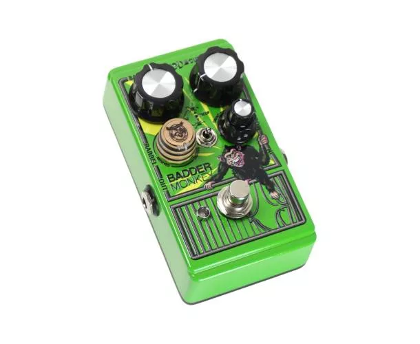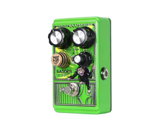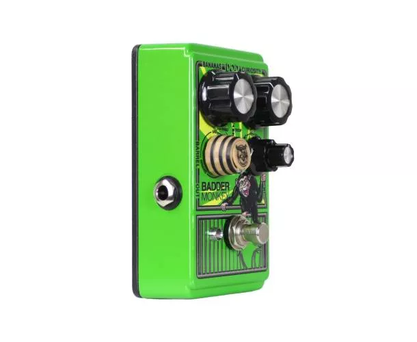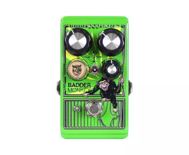 Pédale BADDER MONKEY, évolution de la célèbre Bad Monkey avec son circuit original conservé (Bad) et deux nouveaux circuits (Behaved et Badder), contrôle rotatif Barrel pour mélanger deux des trois circuits, mode Troop activant les trois simultanément, contrôle Mood pour EQ des basses (Grunt) et des aigus (Screech), switch de phase (+ / Troop / -), True Bypass, boîtier aluminium, StagePlate (plaque arrière) réversible (Skid Pad antidérapant ou Hook Pad en velcro pour pedalboard), dimensions 119 x 67 x 57 mm, poids 280 g, alimentation 9V par pile (non incluse) ou adaptateur secteur optionnel.