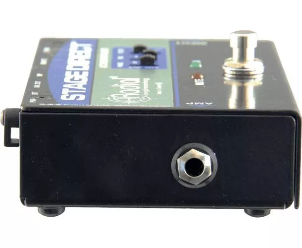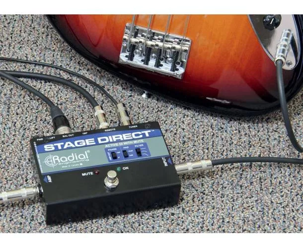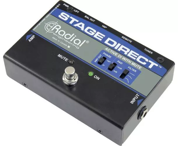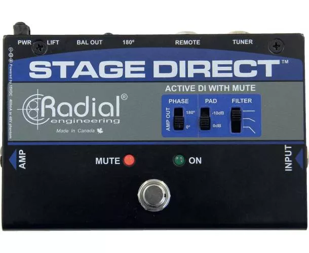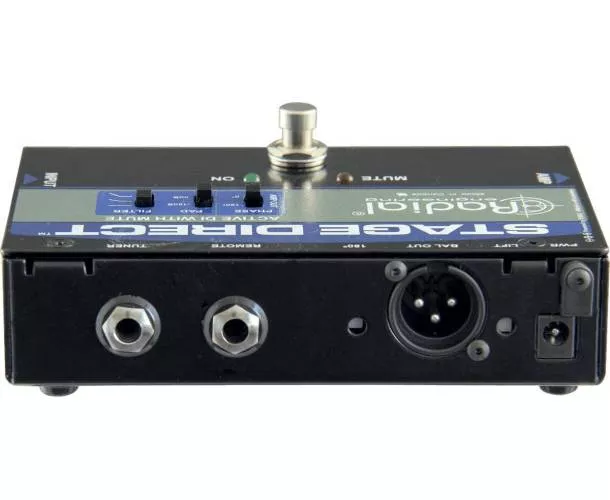 La Radial StageDirect est un boîtier de direct actif idéal pour les musiciens qui recherchent un contrôle accru sur scène. Elle est équipée d'une entrée haute impédance pour instrument, d'une sortie « thru » pour rediriger le signal vers l'amplificateur et d'une sortie symétrique pour le système de sonorisation. Son atout majeur est la sortie accordeur dédiée, ainsi que son format de pédale avec un switch au pied, permettant de couper le signal vers la sortie principale et l'ampli tout en maintenant la sortie du tuner active. Cela permet à l'artiste d'accorder sa guitare tranquillement entre les chansons ou de muter son instrument lorsqu'il n'est pas utilisé. La conception innovante du circuit combine un étage d'entrée en classe A/FET à faible bruit, offrant un son exceptionnel à toutes les fréquences. Un Pad à -15 dB permet de gérer les instruments à fort niveau de sortie, comme les basses actives ou certains claviers. Le filtre passe-haut atténue doucement les basses excessives et les résonances dans le bas du spectre. De plus, un commutateur d'inversion de polarité à 180° aide à résoudre les problèmes de phase sur scène. Une paire de DEL indique si l'appareil est muté ou opérationnel. La commutation peut se faire via la pédale ou par une commande à distance en connectant un switch momentané via un connecteur jack. Cela permet à un technicien de couper l'instrument, de changer de guitare et de gérer le retour en coulisses pour réactiver le signal de l'artiste. L'alimentation peut être fournie par le standard 48V de la console de mixage ou par l'alimentation 15VDC incluse. Cette DI est tout aussi efficace pour les guitares acoustiques que pour les basses, offrant un avantage indéniable pour changer d'instrument sans bruit de commutation dans le système de sonorisation.