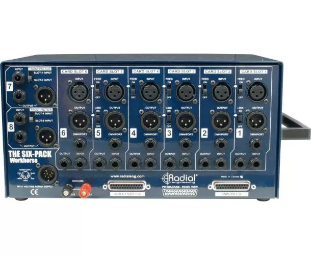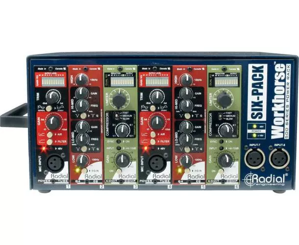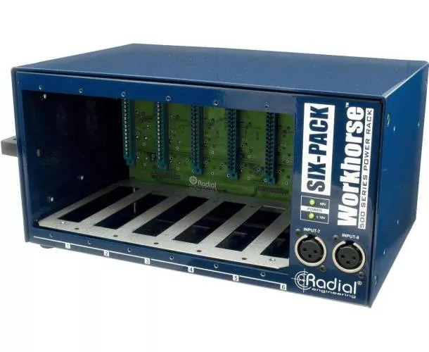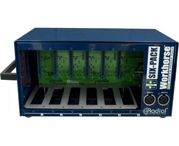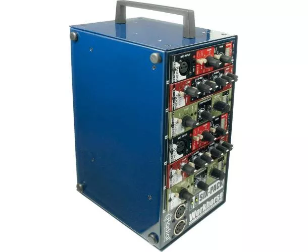 Le SixPack est un rack modulaire au format 500 qui accueille jusqu'à six modules pour créer un double processeur stéréo ou une chaîne de signal unique. La conception en métal assure une durabilité lors des déplacements en studio, tout en protégeant contre les champs magnétiques parasites. L'alimentation externe se connecte via une fiche XLR à 5 broches pour réduire le bruit induit. Chaque carte connecteur de module est compatible avec le standard API grâce à une double face 15-pin EDAC. Une sécurité intégrée empêche qu'un dysfonctionnement d'un module n'affecte les autres. Avec 1,6 ampères de courant partagé, le SixPack prend en charge les modules à lampes les plus exigeants. Le panneau arrière comprend 6 entrées/sorties XLR et jack TRS, permettant de patcher différents modules ou de créer des chaînes de signaux personnalisés. Un connecteur D-Sub 25 facilite l'intégration avec une station de travail audionumérique. Les connecteurs XLR à l'avant permettent d'acheminer des canaux supplémentaires. Parmi les fonctionnalités supplémentaires, un switch 'feed' routant un module vers l'adjacent, et un switch 'link' pour combiner deux modules en configuration stéréo. L'Omniport, un jack TRS, ajoute des fonctionnalités selon le module. Le SixPack peut être disposé à plat ou transporté grâce à une poignée latérale. Des flancs optionnels permettent de l'intégrer dans un mobilier ou de le monter dans un rack 19 pouces.