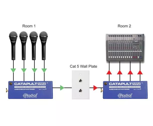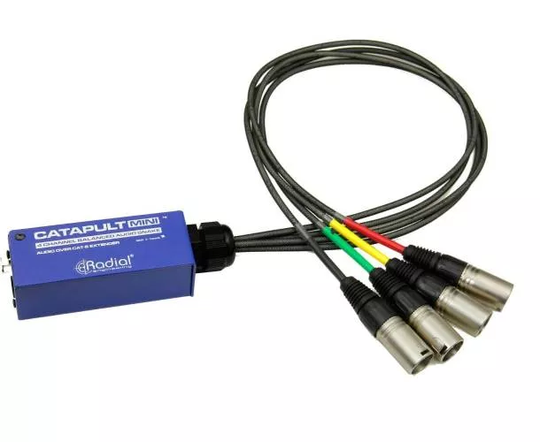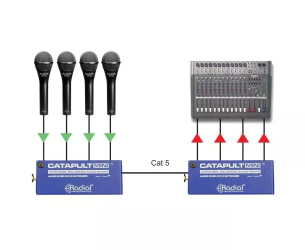 La Catapult Mini RX est un récepteur audio analogique multipaire à 4 canaux. Il reçoit des signaux de niveau micro ou ligne à partir d'un Catapult Mini TX ou d'un autre module Catapult, à plusieurs dizaines de mètres de distance. La transmission s'effectue via un câble réseau Cat.5 blindé.