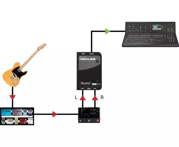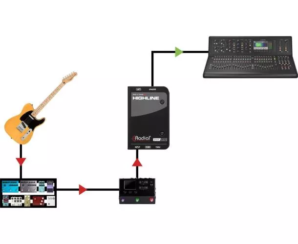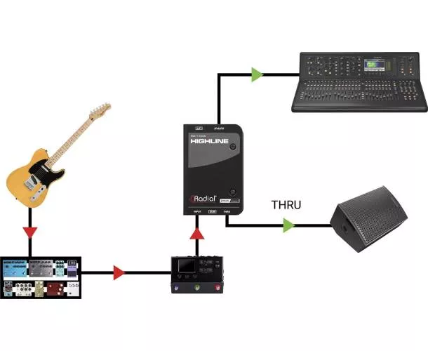 Les guitaristes et bassistes utilisant des modélisateurs d'amplis sur leur pedalboard rencontrent des défis particuliers : bien que ces simulateurs puissent générer des sorties de niveau ligne, ils utilisent souvent des connecteurs asymétriques de 1/4" qui ne supportent pas bien les longs câbles, dégradant ainsi le son. Le Highline résout ces problèmes en insérant un transformateur 1:1 dans le chemin du signal, assurant une isolation pour réduire le bruit, protégeant contre l'alimentation fantôme et maintenant le signal au niveau ligne pour une connexion directe à la sono.