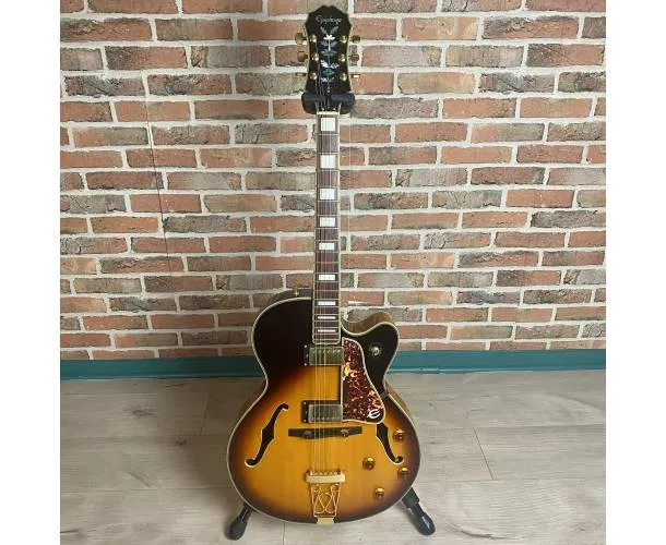 Guitare archtop jazz Epiphone EMPERATOR II VS Joe Pass en Vintage Sunburst, fabriquée dans les années 90 sous licence Gibson. Les modèles "By Gibson" étaient conçus avec un cahier des charges très rigoureux, et les meilleures séries étaient exportées au Japon. Ces guitares sont aujourd’hui recherchées pour leur rapport qualité-prix exceptionnel.