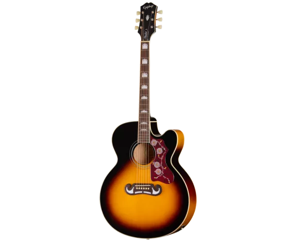 L’Epiphone J-200™ Studio EC fait partie de la toute nouvelle collection Epiphone Studio Acoustic. Ces guitares ont été totalement réinventées afin de pouvoir proposer les modèles acoustiques les plus authentiques inspirés des designs emblématiques de Gibson, à un prix abordable. La J-200 Studio EC associe design classique et fonctionnalité moderne, de quoi séduire aussi bien les musiciens débutants que les plus expérimentés. La guitare acoustique Epiphone J-200 Studio EC est un modèle d’exception, reconnu pour son corps Super Jumbo et sa remarquable projection sonore. Inspirée de la légendaire Gibson SJ-200, surnommée la « Reine des Flat-Tops », cette guitare est dotée d’un pan coupé pour un meilleur accès aux aigus. La J-200 Studio EC présente un corps en érable laminé muni d’un filet quatre couches sur la table et d’un filet monocouche sur le dos, la touche et la tête, ainsi qu’une table en épicéa massif pour un son vif et équilibré avec une excellente plage dynamique qui se bonifiera avec le temps. Le manche en acajou est assemblé au corps par une jonction traversante collée en queue d’aronde conique et présente un profil 1960s SlimTaper™ en D qui assure un grand confort de jeu. Il est surmonté d’une touche en palissandre équipée de 20 frettes standard et ornée d’incrustations de couronnes de taille progressive en perloïde. À l’autre extrémité, les cordes passent sur un sillet compensé en plastique et sont ancrées au chevalet Moustache™ en palissandre à l’aide de chevilles couleur ivoire surmontées d’un point noir. Le chevalet Moustache est orné de quatre incrustations en perloïde.
