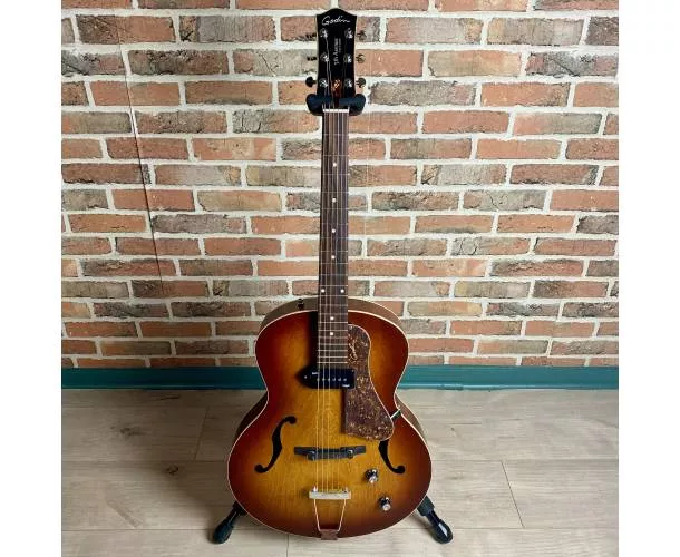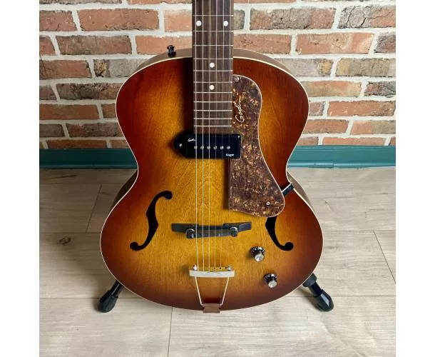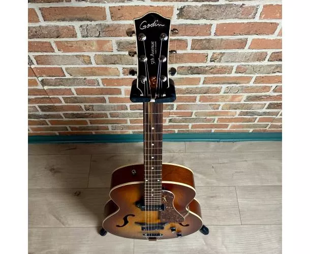 La Godin 5th Avenue Kingpin Cognac Burst est une guitare électrique conçue pour les amateurs de jazz et de sonorités vintage. Sa table bombée en cerisier associée à un corps creux en cerisier lui confère un son chaleureux, riche et résonnant. Équipée d’un micro simple bobinage Godin Kingpin P90, elle offre un caractère clair et articulé, idéal pour les rythmiques et les solos jazz, blues ou soul. Son manche en érable et sa touche en palissandre garantissent un confort de jeu optimal et une précision exceptionnelle, tandis que ses finitions élégantes en Cognac Burst lui donnent un look classique et raffiné.