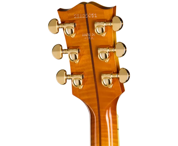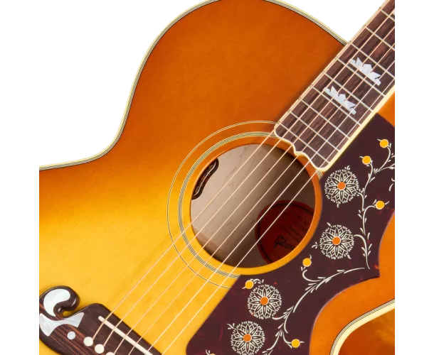 Le pickguard sans bordure présente des graphiques immédiatement identifiables et emblématiques, et le chevalet Moustache™ en palissandre massif est également orné d'incrustations en nacre en forme de sablier et de larme. Pour répondre aux préférences de nombreux musiciens modernes, ce modèle est équipé d'un sillet en os au lieu d'un Tune-O-Matic™. De plus, il est équipé de mécaniques Grover® Rotomatic® dorées pour une stabilité d'accordage optimale, d'un sillet en os et de chevilles de chevalet TUSQ®. Prête pour la scène et le studio, elle dispose d'un système de micro et préampli interne L.R.Baggs™ VTC sous le sillet, avec des contrôles de volume et de tonalité discrètement intégrés dans la rosace. Un étui rigide Gibson est également inclus pour protéger cette guitare emblématique pendant vos déplacements.