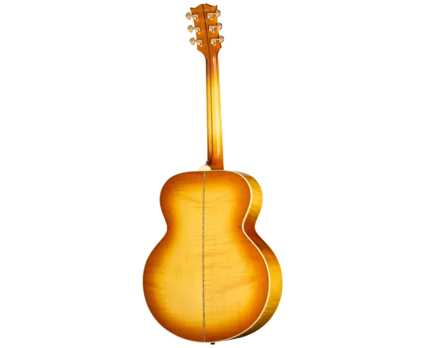 Dotée d'un corps en érable figuré AAA, avec une bande de marqueterie en damier au centre du dos, d'une table en épicéa Sitka AAA massif et d'une finition distinctive au style des années 60 en nitrocellulose, cette guitare est conçue pour l'exception. Le manche en érable en deux parties, avec une barre de renfort en noyer et un profil rond confortable, facilite le jeu des accords en première position grâce à son sillet plus étroit de 1,687 pouce. La touche en palissandre est ornée d'incrustations classiques en nacre graduées en forme de couronne, l'une des caractéristiques visuelles de la SJ-200, et est équipée de 20 frettes standard.