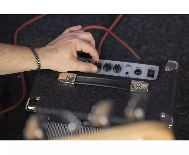 Petit combo signé EKO, conçu pour l'entraînement à domicile et les petites répétitions. Léger et facile à transporter, il propose une interface épurée avec contrôle de volume, égalisation pour sculpter le timbre, une entrée pour lecteur externe et une sortie casque pour travailler en silence.
