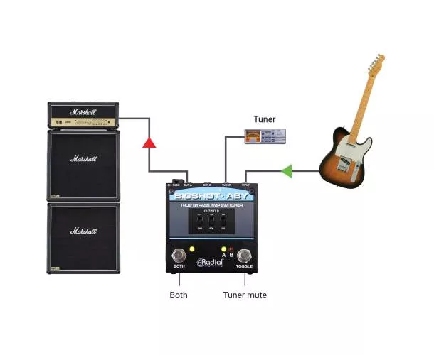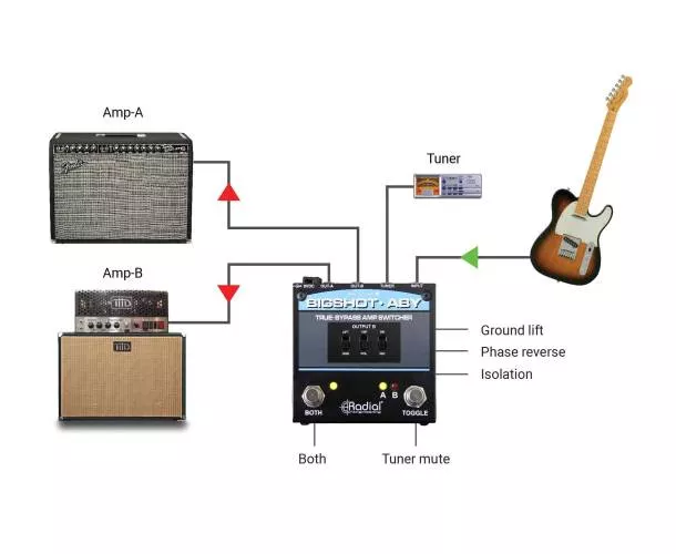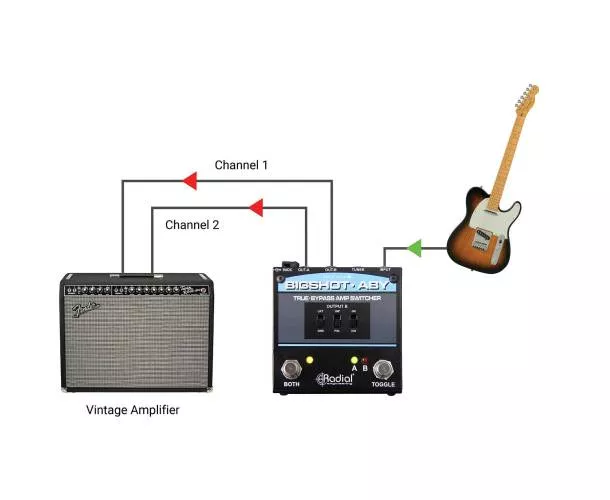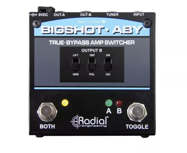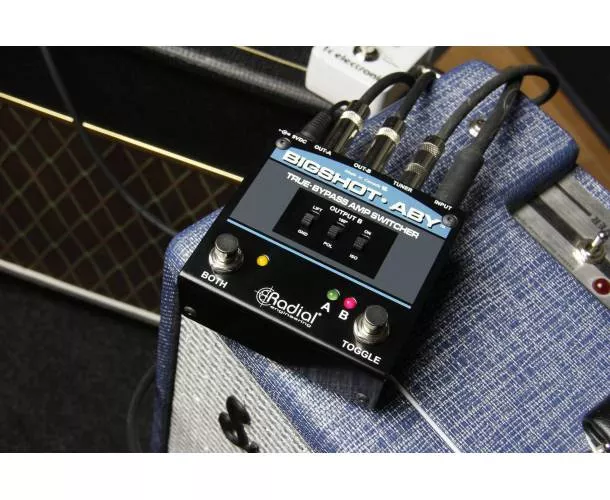 Le Radial Engineering Bigshot ABY est un sélecteur passif pensé pour basculer instantanément entre deux amplis (A/B) ou les utiliser en parallèle (A+B), sans altérer votre signal grâce au true bypass. Idéal sur scène comme en studio, il vous permet de comparer deux sons, de doubler votre diffusion ou de gérer deux chaînes d’amplification avec une ergonomie de pédale simple et robuste.
