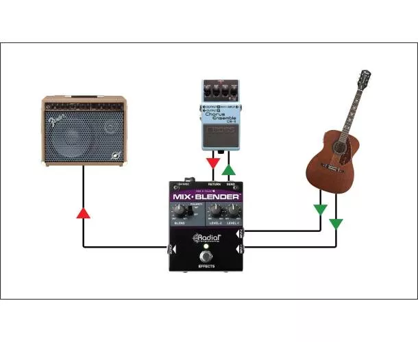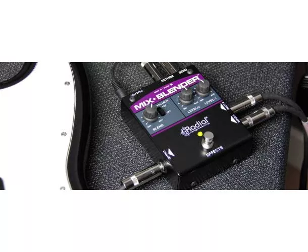 Le Radial Engineering Mix-Blender est une pédale analogique pensée pour simplifier les rigs de scène et de studio : elle permet de mélanger deux sources (deux instruments, deux sorties, ou deux chemins) grâce à des niveaux indépendants, puis d’envoyer ce signal combiné vers une boucle d’effets activable au pied.