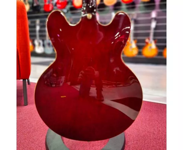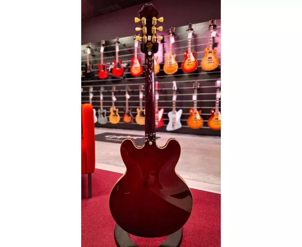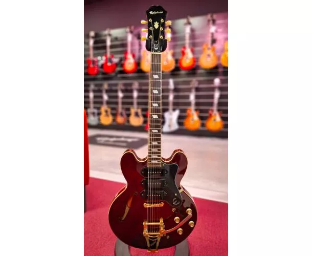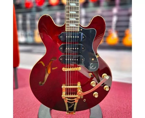 Cette Riviera P93 (série limitée 2017) combine l’esprit semi-hollow et une vraie polyvalence grâce à ses trois P-90 Dogear Alnico V, offrant attaque, chaleur et dynamique pour naviguer du jazz à la pop, du blues au hard rock. Le vibrato Bigsby B70 apporte une touche expressive et vintage, tandis que la finition translucide Wine Red et l’accastillage doré signent un look premium immédiatement reconnaissable.