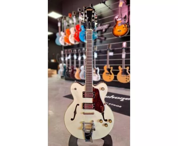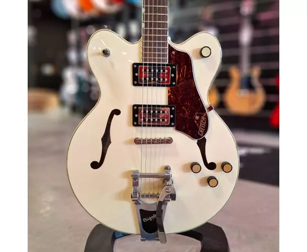Cette Gretsch G2622T (numéro de série IS240705109) est une guitare d’occasion en bon état, idéale pour qui cherche le grain Gretsch entre clarté, attaque et rondeur. Sa conception à center block apporte plus de tenue face au larsen tout en conservant le caractère semi-hollow, et le Bigsby permet des vibratos souples sans perdre l’esprit vintage.